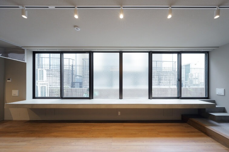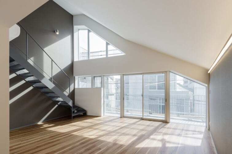 本物件は、戸建住宅や小規模なアパートが建ち並ぶ富ヶ谷エリアに位置し、北から南へ緩やかに登る丘の途中にあることから、坂のある街の高低差を活かすことが求められました。