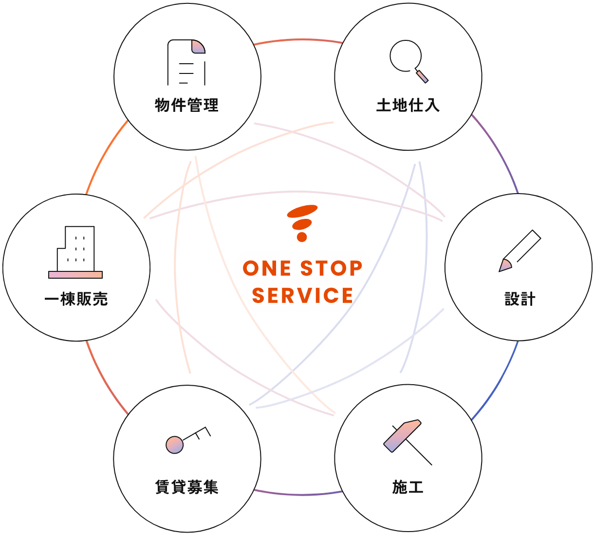 土地の仕入れから設計・施工・賃貸募集・一棟販売、その後の物件管理までをワンストップで手掛け、「お客様に寄り添い、一緒に夢を叶える」という熱い想いがこの理念に込められています。
